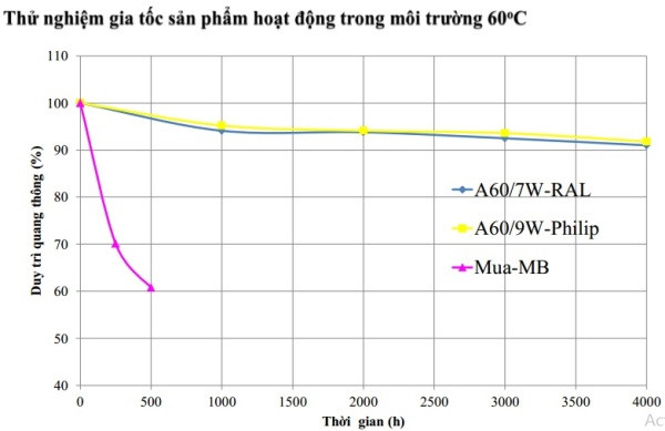 Trong môi trường 60 độ C, quang thông của đèn LED giá rẻ chỉ còn 60% khi hoạt động trong vòng 500 giờ. Nguồn: Rạng Đông.
