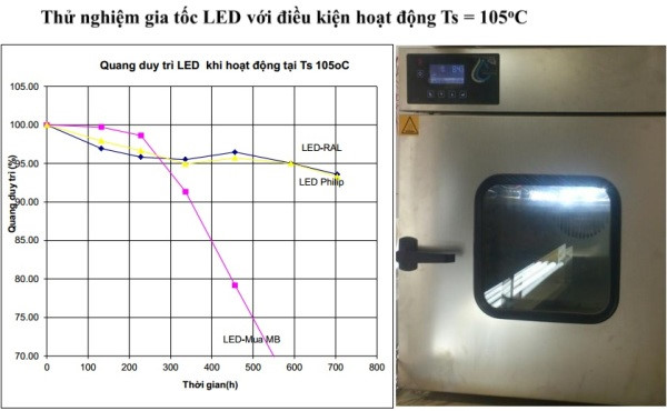 Tại nhiệt độ 105 độ C, quang thông của đèn LED giá rẻ đã giảm còn 70% sau hơn 500 giờ hoạt động. Nguồn: Rạng Đông.